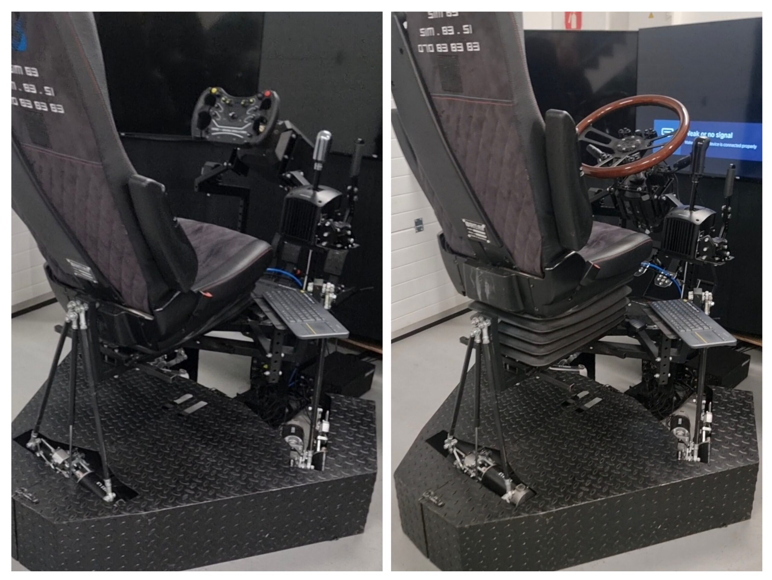- Rekonfiguracija pedal: Plošča s pedali se premakne, da omogoči bolj pokončen kot sedenja. To je ključno za gib “ptiskanja navzdol”, ki je značilen za zaviranje tovornjakov, v nasprotju z “potiskanjem naprej” pri formulah.